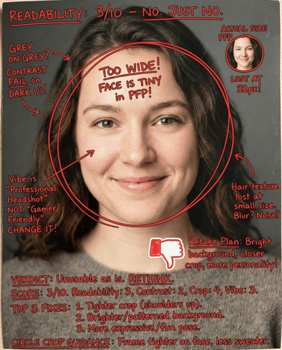 AI-rates your Discord profile picture for clarity at tiny sizes, personality fit, and vibe. Flags blur, busy backgrounds, and low-contrast faces—then gives a clean retake checklist.