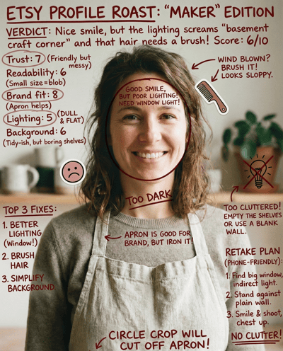 AI-rates your Etsy seller profile photo for buyer trust, real maker authenticity, and small-avatar clarity. Flags messy backgrounds and low-quality selfies—then gives a simple retake plan that boosts credibility.