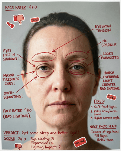 AI-rates your eye area for awake and attractive vibes in photos. Flags squint, harsh shadows, and tired lighting—then gives simple pose and lighting fixes to make your eyes look better on camera.