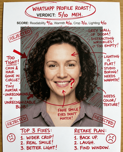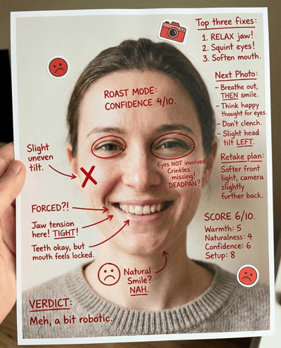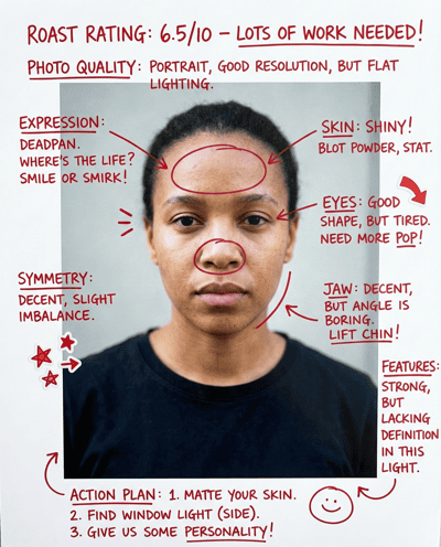 AI-rates your face for professional first impression: trust, competence, and friendliness. Flags tired lighting and awkward expressions—then gives a practical checklist for a stronger professional look.