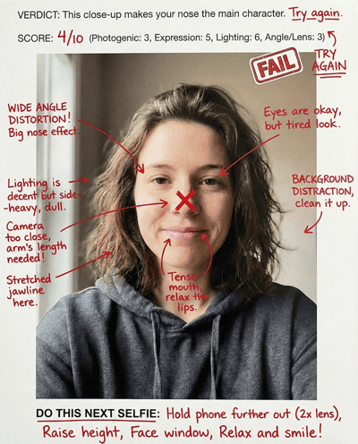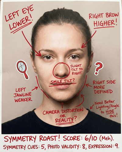 AI-rates facial symmetry and balance cues from your photo. Explains what is real vs camera distortion, then gives styling and photo tips to look more symmetrical on camera.