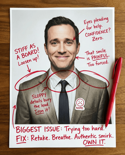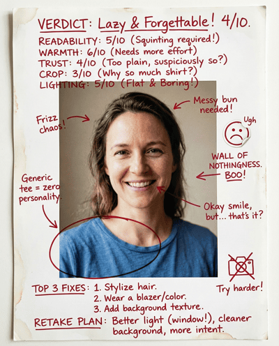 AI-rates your LinkedIn headshot for trust and polish. Flags lighting, background, grooming, outfit, and crop issues—then gives a clear retake checklist.