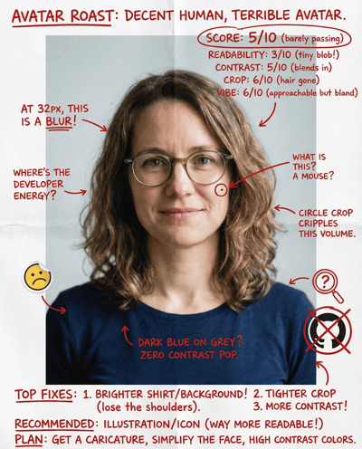 AI-rates your GitHub avatar for recognizability at tiny sizes, developer-brand vibe, and professionalism. Flags noisy crops and low contrast—then gives a simple avatar upgrade plan (photo or illustration).