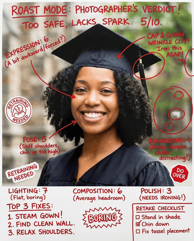 AI-rates your graduation photos for “proud and polished” vibes. Checks cap/gown fit, lighting, background clutter, and posing—then gives a clear retake plan for campus portraits and family sharing.