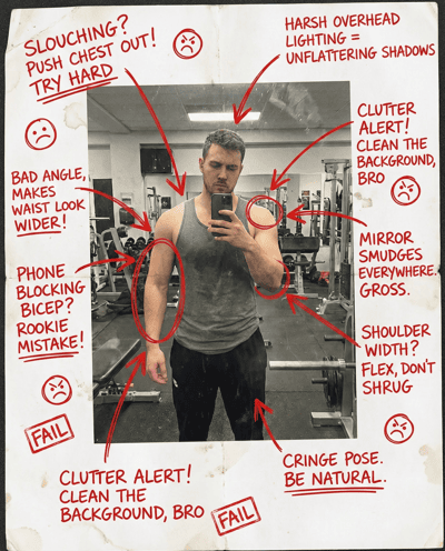Make your gym mirror selfie look leaner and cleaner. Checks posture, lighting, mirror/background mess, and angles—so you show physique without cringe and get better keepers.