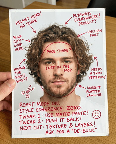Get persona feedback on your haircut and grooming. Checks face framing, volume, parting, flyaways, and styling—then gives quick fixes plus a clear direction for your next cut.