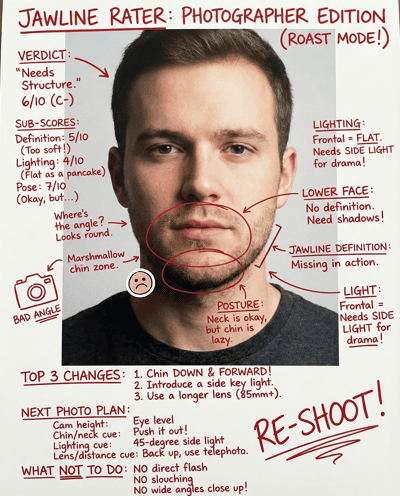 AI-rates your jawline definition and lower-face structure in photos. Explains what's angle/lighting vs real, then gives simple posing and lighting tips for a sharper jawline on camera.