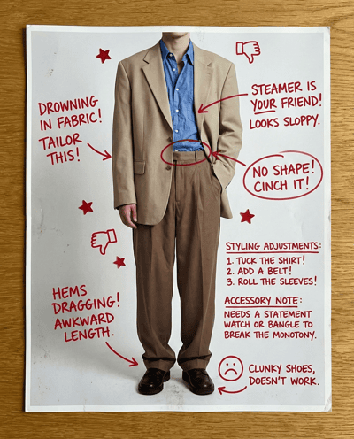 Rate your outfit for fit, proportions, and overall polish. Spots what makes you look shorter, wider, or messy—then gives quick styling tweaks and accessory notes to level up fast.