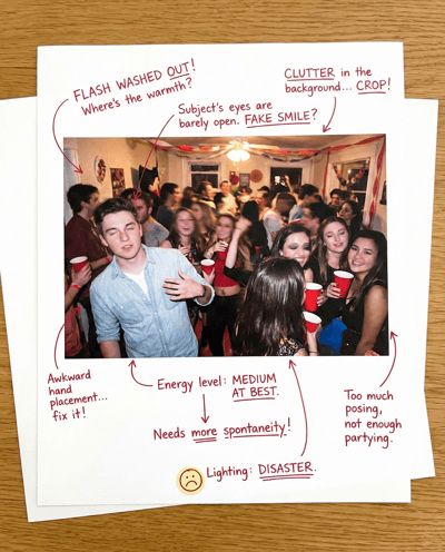 Make your party photo look fun, social, and clean. Flags flash disasters, awkward hands, messy backgrounds, and tired expressions—then gives quick fixes for a post-worthy shot.