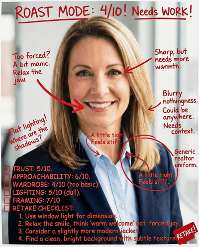 AI-rates your real estate headshot for trust, competence, and “would I call you?” energy. Checks lighting, grooming, outfit, and background—then gives a retake plan for listings and agent profiles.