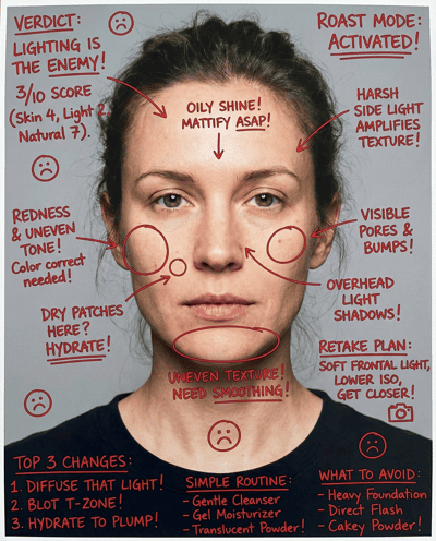 AI-rates how your skin looks in photos. Flags harsh lighting, oil shine, redness, and texture exaggeration—then gives a photo-friendly routine and lighting tips to look smoother on camera.