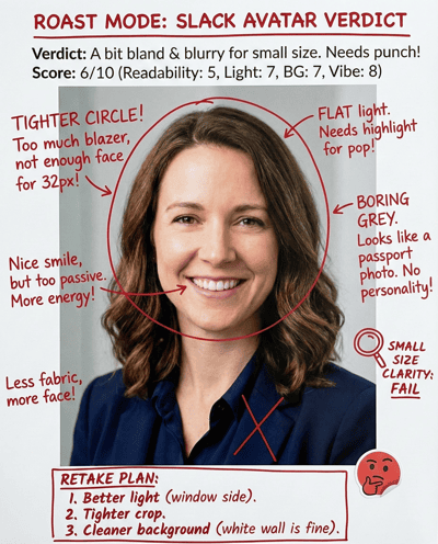 AI-rates your Slack profile photo for “instant trust” in workplace chat. Checks clarity, lighting, crop, and professionalism—then gives a fast retake plan that works in small avatars.