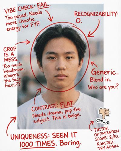 Optimize your TikTok profile picture for clicks and instant vibe. Checks crop, contrast, expression, and distinctiveness—so you’re recognizable in fast feeds and get more taps.