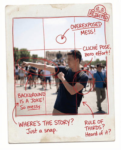 Make your travel photo feel cinematic, not touristy. Checks composition, subject separation, horizon/lines, and natural posing—then gives one framing and one pose fix.